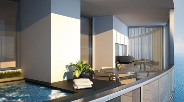 Bên ngoài ban công căn hộ là nơi thư giãn, có bể bơi và bể sục riêng.