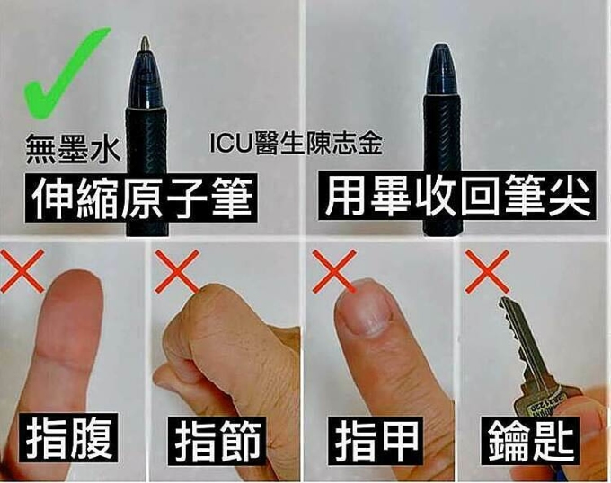 Đây là cách không ít người đang dùng và theo Tân Phát nó khá hiệu quả. Khi dùng bút hết mực, các phím sẽ không bị bẩn. Dùng xong thì thu ngòi vào. Như vậy bạn sẽ không phải chạm vào vùng tiếp xúc với thang máy. Để an toàn hơn, thi thoảng nên ngâm đầu bút trong nước rửa tay.