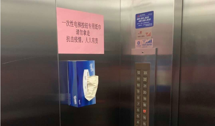 Một hộp khăn giấy cạnh bảng điều khiển thang máy đã được nhiều toà chung cư ở Trung Quốc áp dụng để cư dân đi lại, với mục đích hạn chế chạm phải các nút bấm, tránh lây nhiễm virus corona. Một số chung cư còn gắn các tập giấy nhớ vào nút "lên, xuống", ấn xong thì xé một tờ bỏ đi.
