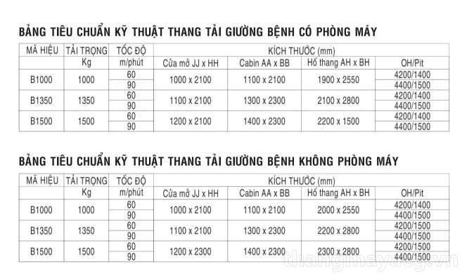1. Tải trọng = 1000 kg; Tốc độ = 60 – 90 m/ phút; Cửa mở JJ X HH = 1000 mm x 2100 mm; Cabin AA x BB = 1100 mm x 2100 mm; Hố thang AH x BH = 2000 x 2550 mm; OH/ Pit = 4200/ 1400 – 4400/1500 mm.
