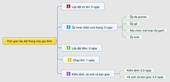 Thông thường một chiếc thang gia đình khoảng từ 4 đên 7 tầng sẽ mất chừng 5 ngày để hoàn thiện việc lắp đặt phần cơ khí. Khi giai đoạn này xong thì đến 90% thiết bị thang máy đã được gắn cố định vào hố thang.