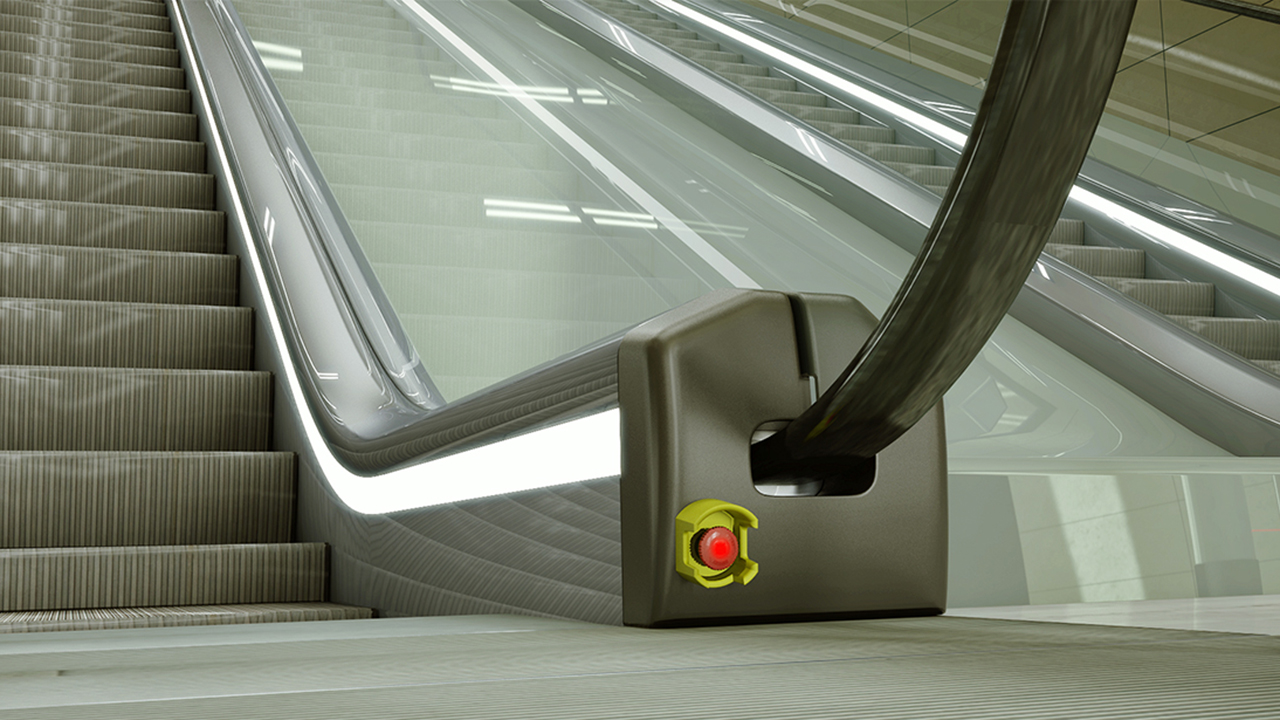 Nút dừng khẩn cấp của hệ thống thang cuốn thường nằm ở đầu hoặc cuối thang cuốn,